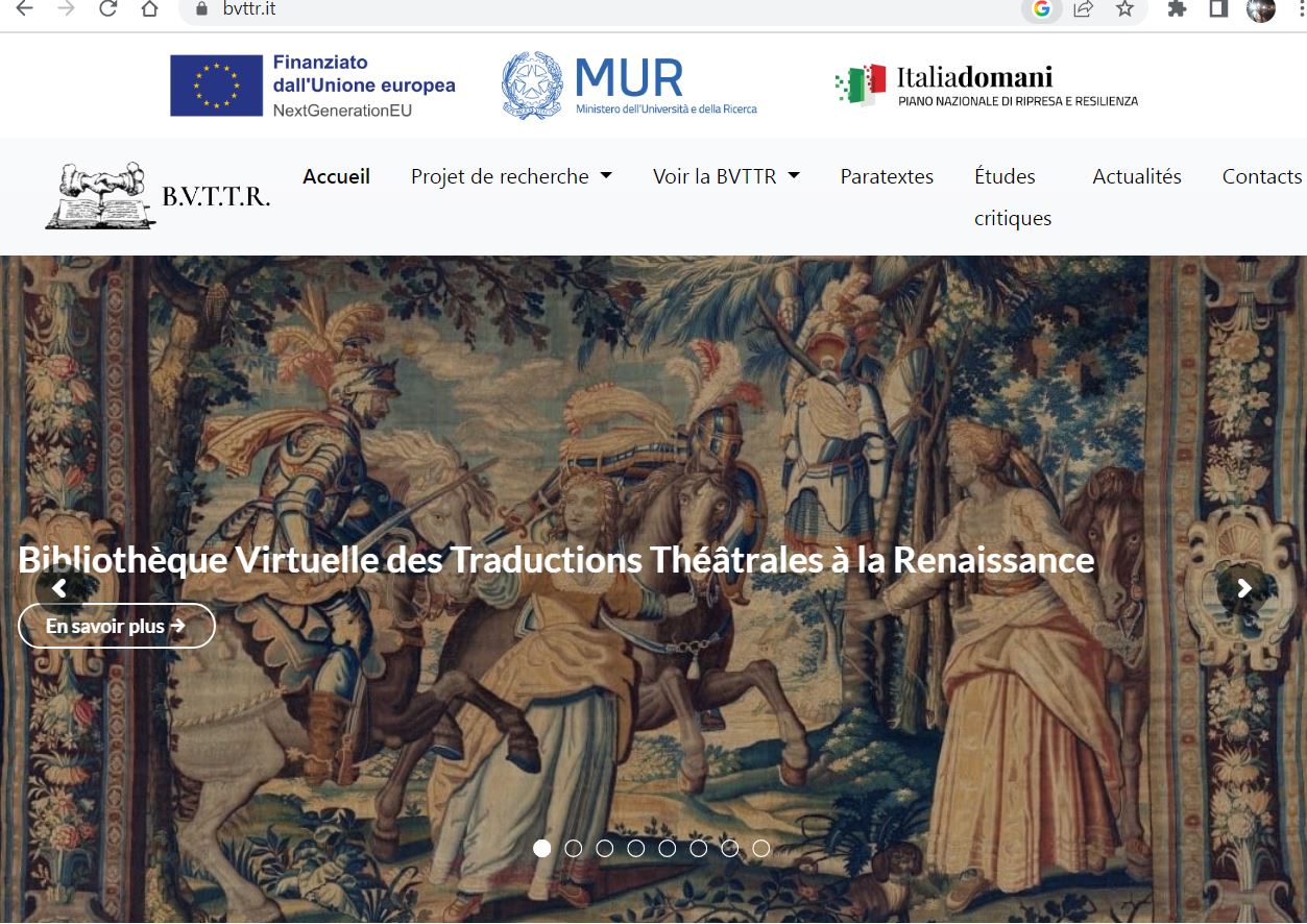La BVTRR (https://bvttr.it/) est le résultat du projet « Revisiting and E-Mapping Theatre Translations of Ancient and Modern Classics in 16th-century France » (projet PRIN PNRR 2022). L'objectif principal du projet est de réaliser une étude extensive et comparative d’un corpus inédit constitué par les traductions françaises du XVIe siècle de pièces anciennes (grecques et latines) et modernes (italiennes). Les archives numériques de la « Bibliothèque Virtuelle des traductions théâtrales à la Renaissance » (BVTTR) représentent le principal résultat du projet. La BVTTR comprend des éditions numériques de traductions françaises du début de l’époque moderne (avec des annotations codées au moyen d’outils de visualisation) ainsi qu’une base de données des éditions du début de l’époque moderne qui ont été traduites d’après des pièces de théâtre anciennes et modernes. Le cadre de ce travail s’appuie sur des projets antérieurs qui ont déjà prouvé tout le potentiel de ce domaine de recherche (comme le projet Théâtre Français de la Renaissance, DUBI, la base de données Digital Pléiade ou les archives numérique DHT).